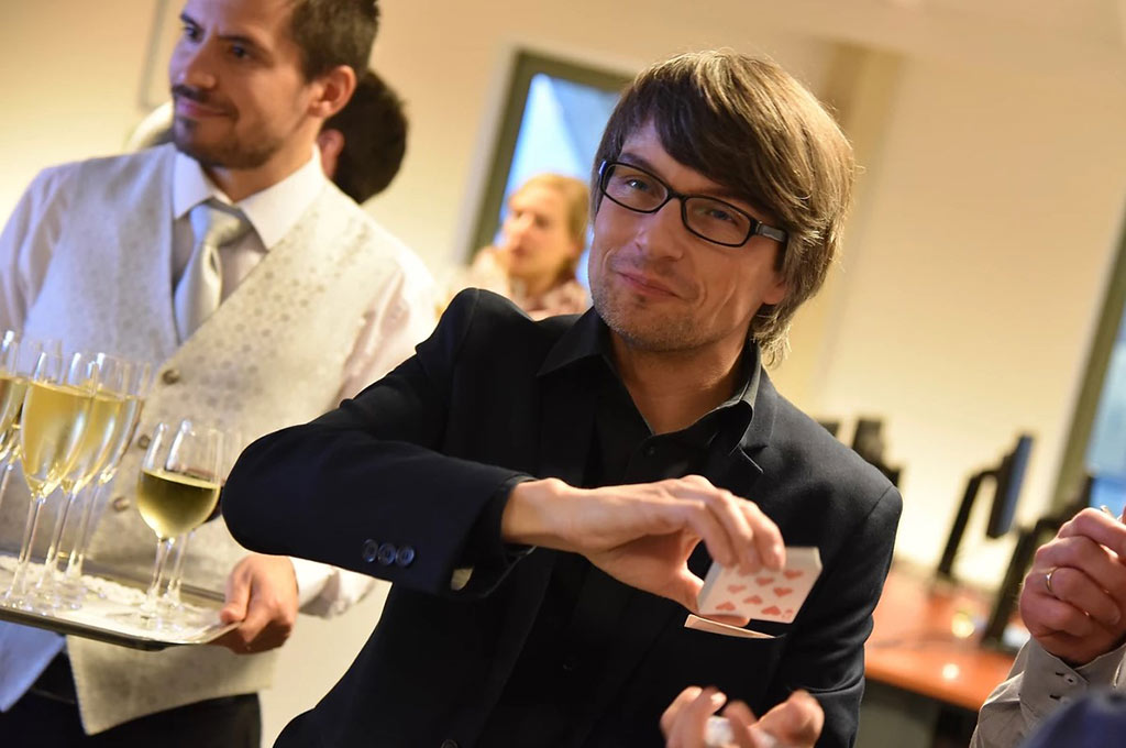 Frédéric anime vos invités en passant de table en table lors d’un d√Æner ou en déambulant lors d’un cocktail parmi vos h√¥tes et accomplit des tours aussi variés les uns que les autres (balles, cartes, foulards, billet,…)